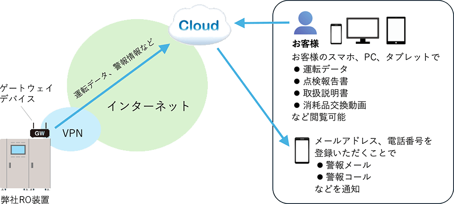 - 透析用水作製装置の警報発生時には、予め登録したお客様のメールアドレスにメールを自動送信し、警報内容を通知します。